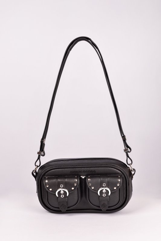 Seu diferencial está nos dois bolsos frontais estruturados, com fivelas decorativas, tachas e acabamento em metal ao redor, que agregam personalidade e um toque moderno ao look. Esses bolsos são ideais para guardar itens pequenos de fácil acesso, como chaves, fones ou cartões.