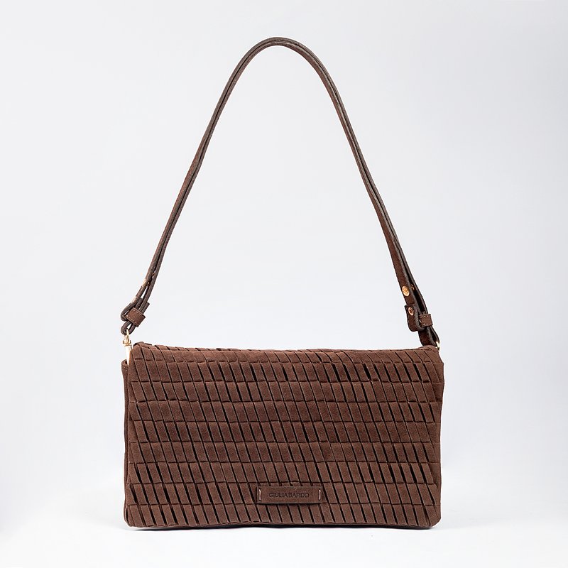Descrição: Bolsa Feminina de ombro de tamanho médio com formato retangular e linhas minimalistas, Produzida em camurça macia, oferece toque aveludado e visual elegante. Possui alça ajustável e removivel para ser utilizada na transversal ou como clutch. Conta com a parte frontal com um trançado e logo da marca que adiciona um detalhe moderno e refinado. Internamente possui forro e bolso com o nome da marca, espaço ideal para todos os itens essenciais.