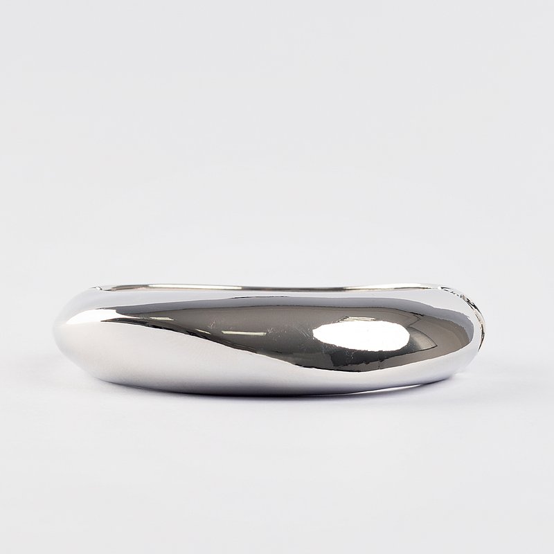 Descrição: Bracelete tem formato ovalado com perfil arredondado e levemente irregular, o que cria um efeito orgânico e moderno. Ele é rígido, com abertura articulada (fecho de pressão invisível) que facilita vestir sem precisar ajustar. O acabamento é liso, polido e espelhado, refletindo a luz e conferindo um visual sofisticado. É uma peça marcante, ideal para compor looks elegantes ou dar um toque de requinte a produções mais básicas.