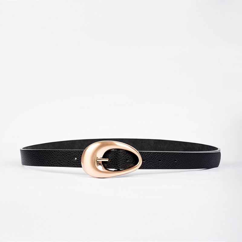 Cinto feminino preto com tira média e textura leve. O acessório possui fivela metálica dourada em formato orgânico e arredondado, com acabamento polido. Parte interna em material liso. Para uso na cintura ou quadril, e fechamento regulável por furação.