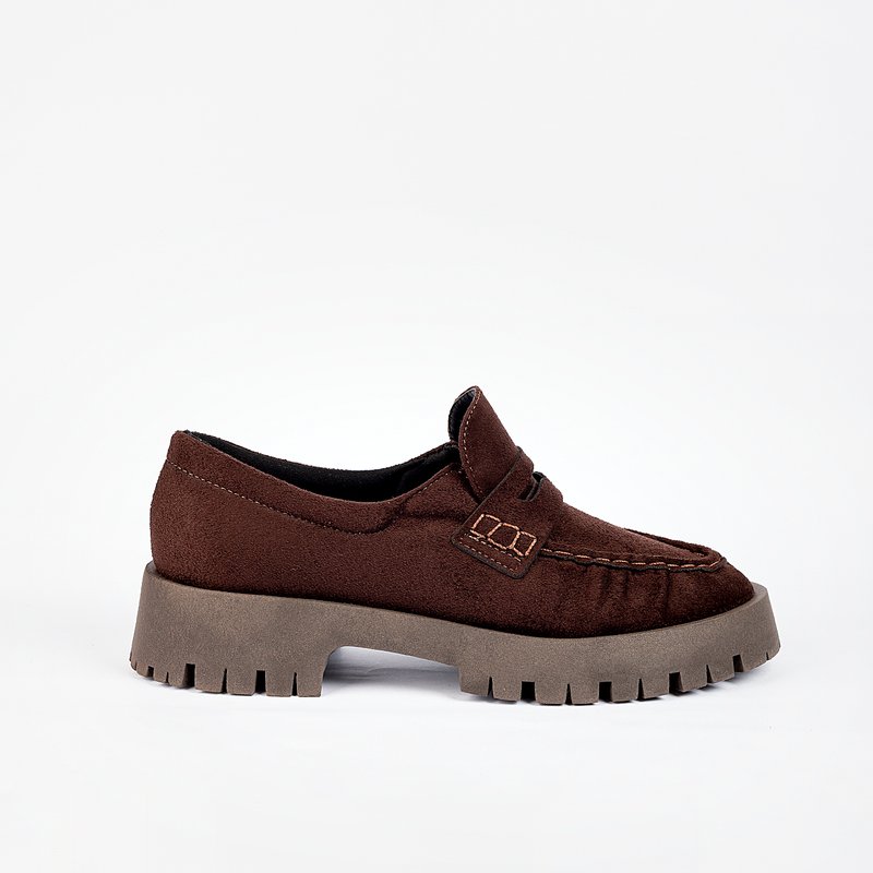 O acabamento acamurçado revela uma textura suave e sofisticada, enquanto a costura aparente em moc toe valoriza a construção clássica do mocassim. A sola robusta com tratorado marcante adiciona personalidade ao modelo, criando um contraste moderno que equilibra tradição e atitude contemporânea.