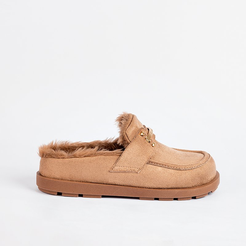 Descrição: O Brunelle é um mule cozy de inverno que combina praticidade e elegância. Em acabamento acamurçado e forro interno em pelo macio, envolve os pés com conforto e aquecimento. A tira com detalhe metálico dourado eleva o design, enquanto a sola robusta garante estabilidade ao caminhar. Ideal para looks urbanos e produções comfy com personalidade.