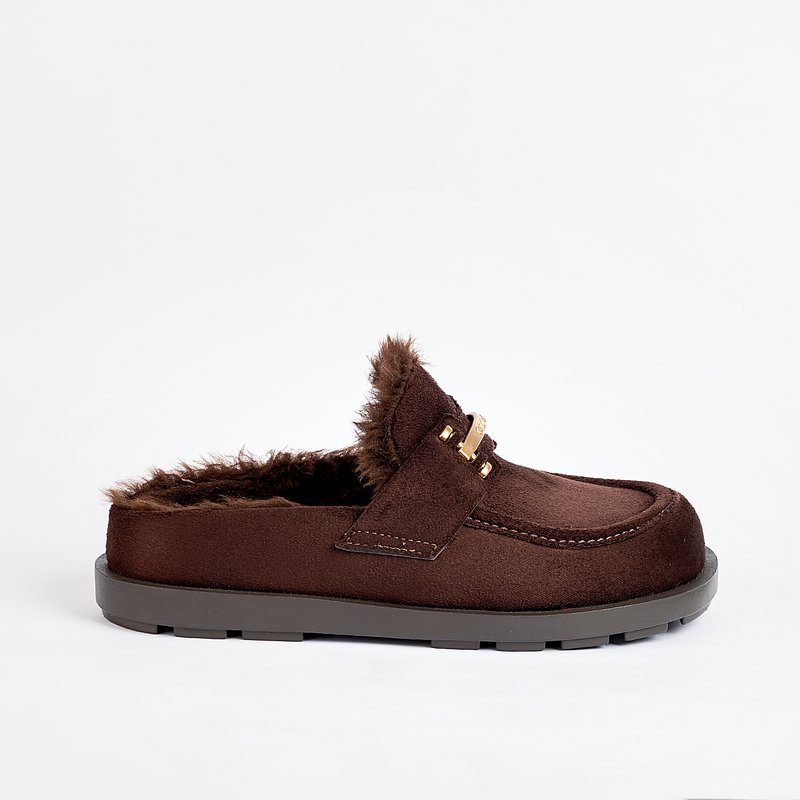 Descrição: O Brunelle é um mule cozy de inverno que combina praticidade e elegância. Em acabamento acamurçado e forro interno em pelo macio, envolve os pés com conforto e aquecimento. A tira com detalhe metálico dourado eleva o design, enquanto a sola robusta garante estabilidade ao caminhar. Ideal para looks urbanos e produções comfy com personalidade.