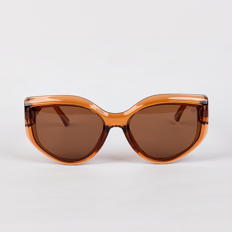 Descrição: Óculos em acetato âmbar translúcido com lentes marrons.