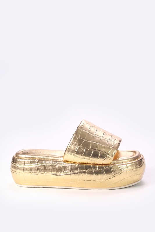 O design exclusivo da Sandália apresenta uma textura de jacaré que envolve o cabedal, conferindo um toque de sofisticação e um visual intrigante. As escamas delicadamente esculpidas proporcionam uma aparência tridimensional deslumbrante, destacando-se com uma luminosidade metalizada que adiciona um brilho irresistível.
