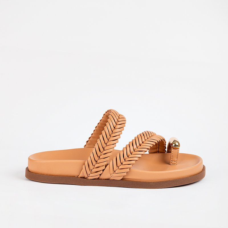 Descrição: Papete feminina confeccionada em PU Premium, com duas tiras largas em trama entrelaçada, trazendo textura. Apresenta divisor de dedo com aplicação metalizada arredondada.