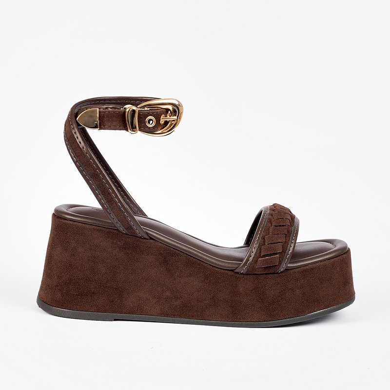 Descrição: Sandália plataforma em camurça. Modelo com tira frontal média tramada. Possui tiras que saem das laterais, cruzam na parte traseira, contornam o tornozelo e fecham em fivela lateral. Com palmilha acolchoada e inscrição do nome da marca. Confortável e moderna, é ideal para compor produções despojadas com estilo.