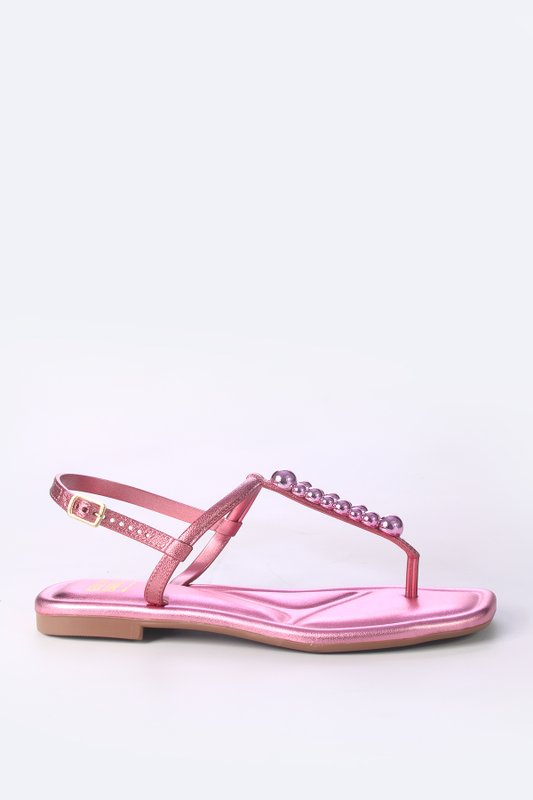 Para adicionar um toque de sofisticação, a sandália apresenta um efeito metalizado que confere um brilho sutil e elegante a cada passo. Além disso, um enfeite de esferas brilhantes, cuidadosamente dispostas, complementa o design, criando um visual deslumbrante e diferenciado.
