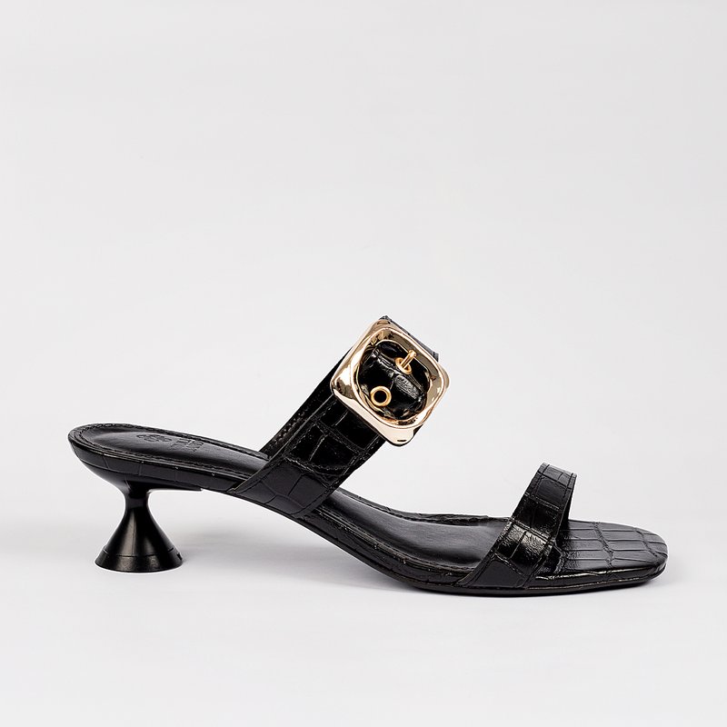 Elegante e atual, este modelo une o clássico do preto com a sofisticação da textura croco e da fivela dourada. O salto taça baixo garante conforto sem abrir mão do estilo, tornando a sandália perfeita para acompanhar looks do dia a dia ao jantar mais especial. Uma peça curinga para elevar qualquer produção.