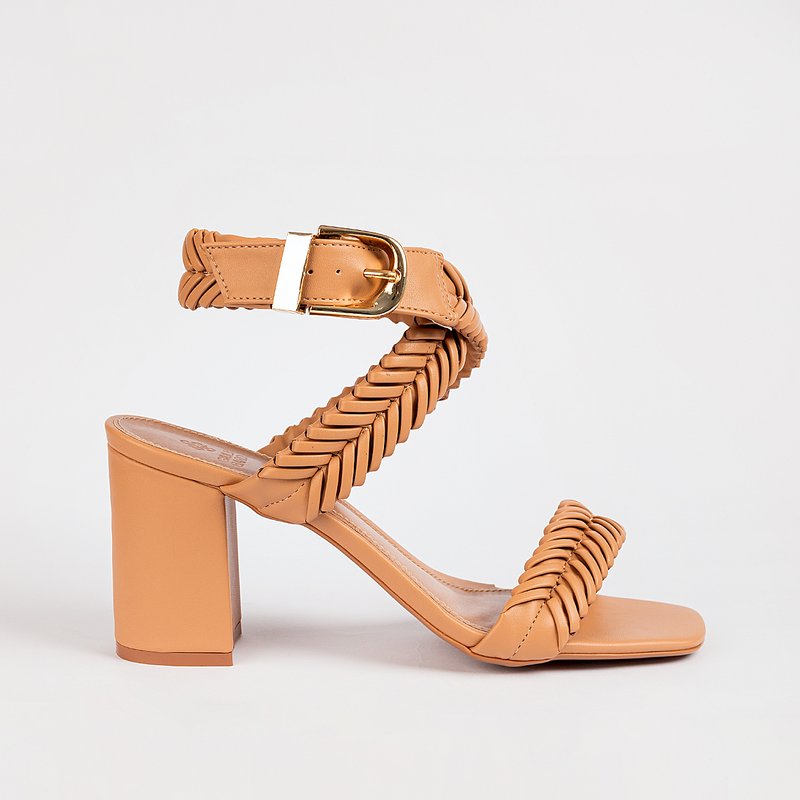 Descrição: Sandália de salto bloco em P.U Premium. Possui salto médio, bico quadrado levemente arredondado e tiras trançadas com acabamento impecável. Conta com fechamento em fivela dourada no tornozelo. Um modelo sofisticado, que valoriza o pé e traz uma estética rica.