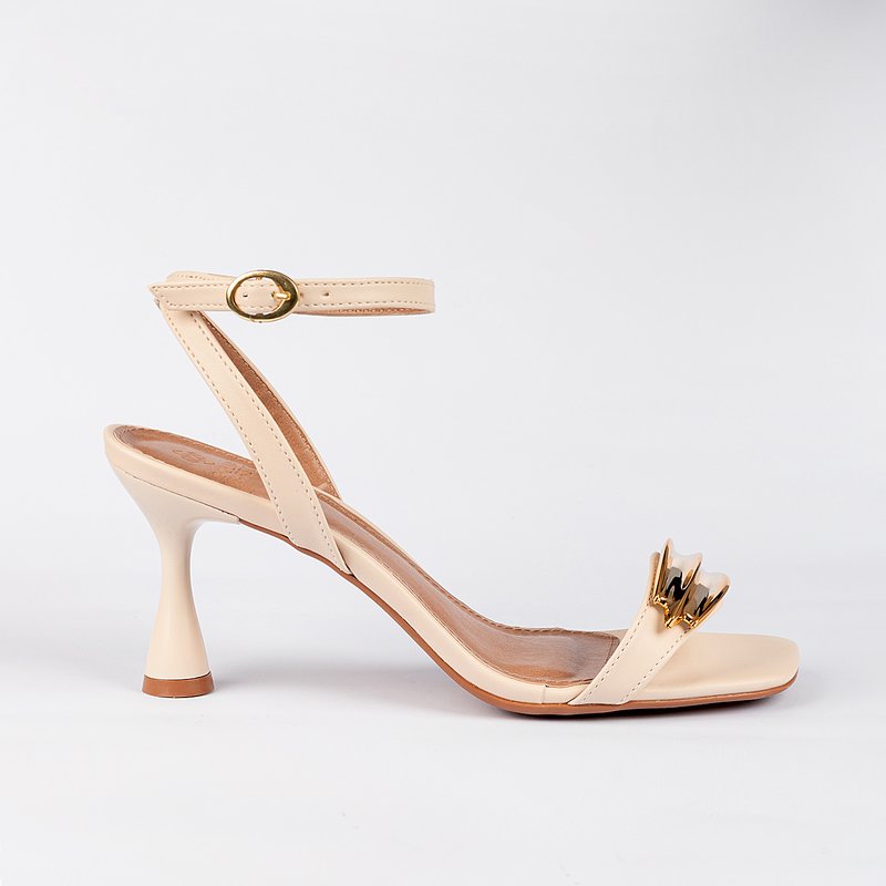 Descrição: Sandália feminina em acabamento liso. O modelo tem salto alto taça e bico quadrado. Possui tira fina sobre os dedos com detalhe metalizado em dourado, tira no calcanhar e fechamento por fivela ajustável no tornozelo. Aberta, exibe todo o pé e adiciona um toque de sofisticação a qualquer produção.