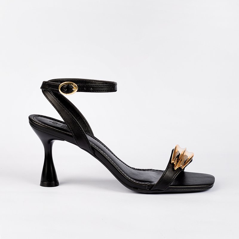 Descrição: Sandália feminina em acabamento liso. O modelo tem salto alto taça e bico quadrado. Possui tira fina sobre os dedos com detalhe metalizado em dourado, tira no calcanhar e fechamento por fivela ajustável no tornozelo. Aberta, exibe todo o pé e adiciona um toque de sofisticação a qualquer produção.
