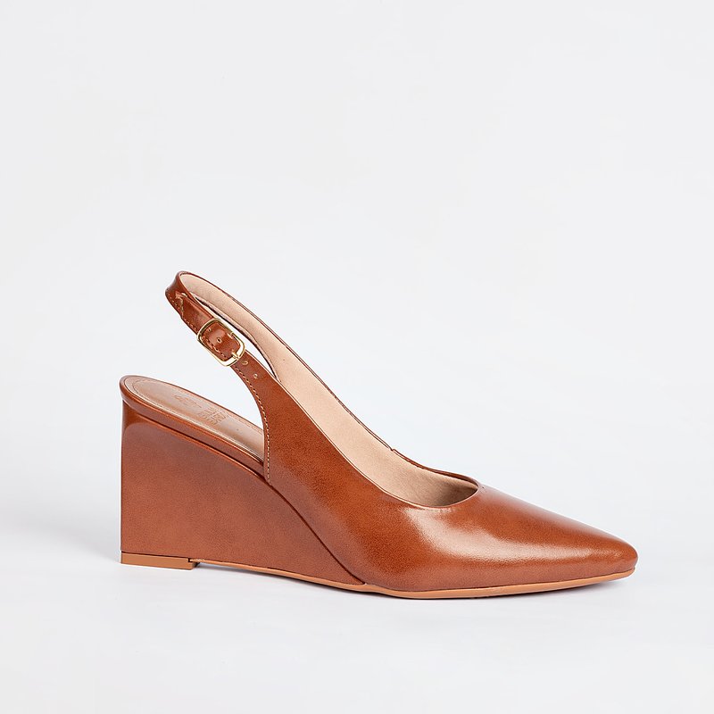 Descrição: SlingBack Sophia em acabamento liso e design clean. Com salto anabela de altura média, oferece estabilidade e conforto ao caminhar. O bico fino alonga a silhueta, enquanto a tira traseira com fivela garante ajuste seguro. Versátil e refinado, é ideal do office ao dia a dia com elegância.